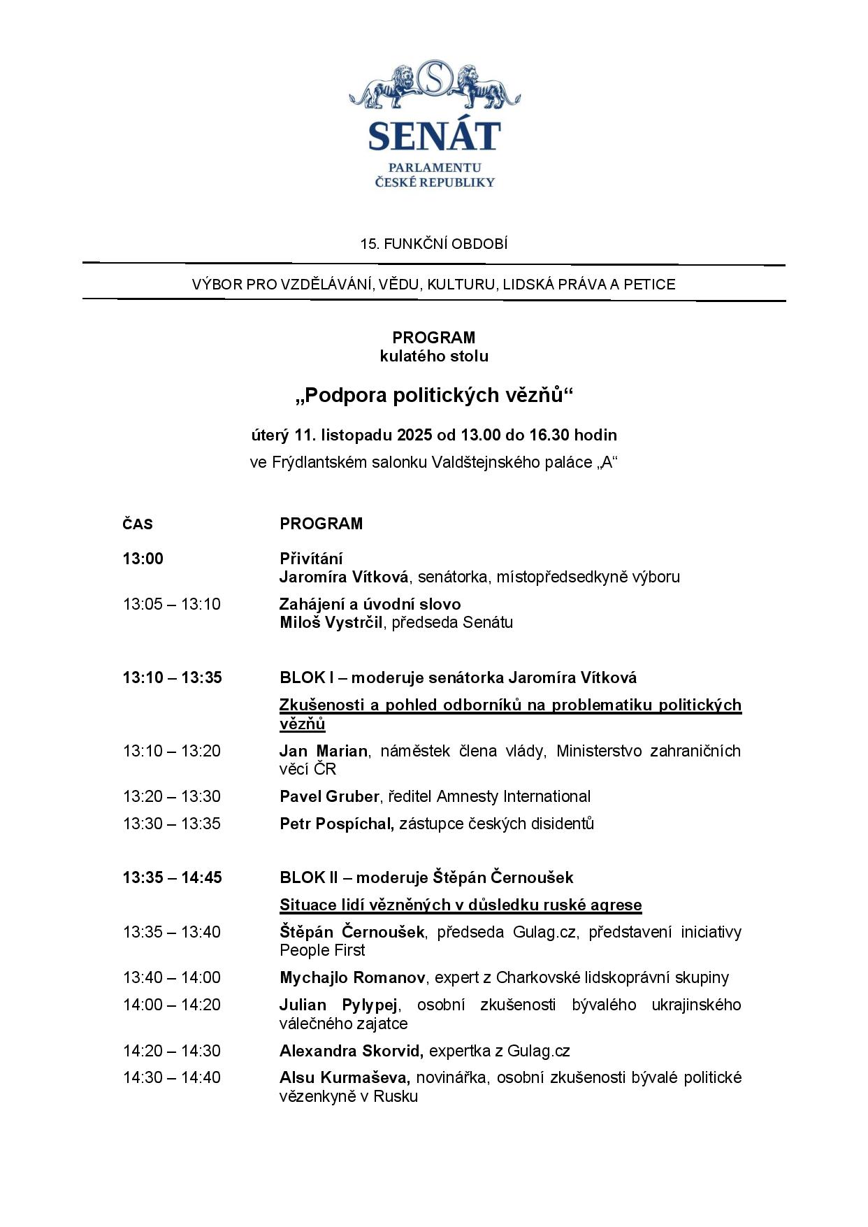 Kulatý stůl "Podpora politických vězňů" 11.11.2025